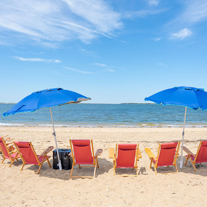 Hosting a beach day on Nantucket for a group? We’ll take care of the setup—so you can focus on the fun. The Party Beach Package includes 7 to 14 classic wood and canvas beach chairs, two large umbrellas, and two coolers—delivered and set up at your preferred Nantucket beach.